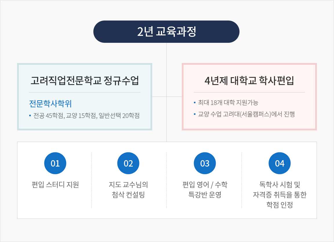 • 본교(고려직업전문학교) 2년 정규 수업을 통하여 전공 45학점/ 교양 15학점 / 일반선택 20학점 이상을 이수하게 되면 전문학사 학위를 수여