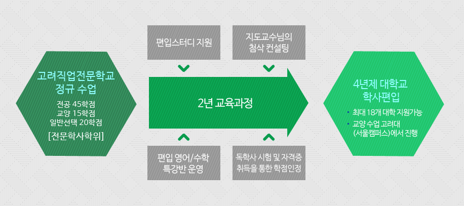- 1) 본교(고려전문학교) 2년 정규 수업을 통하여 전공 45학점/ 교양 15학점 / 일반선택 20학점 이상을 이수하게 되면 전문학사 학위를 수여 받게 되어 일반편입 조건에 충족하게 됩니다.