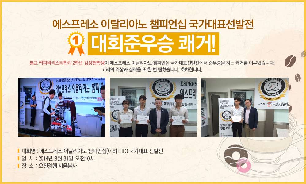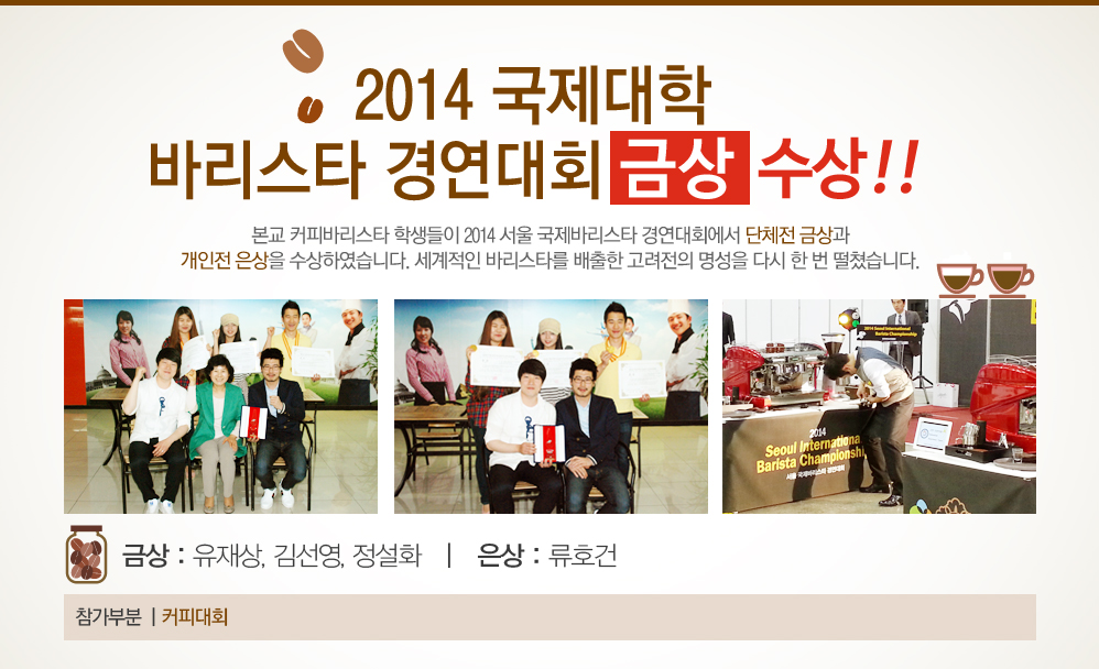 - [5월] 2014 국제대학 바리스타 경연대회 금상수상