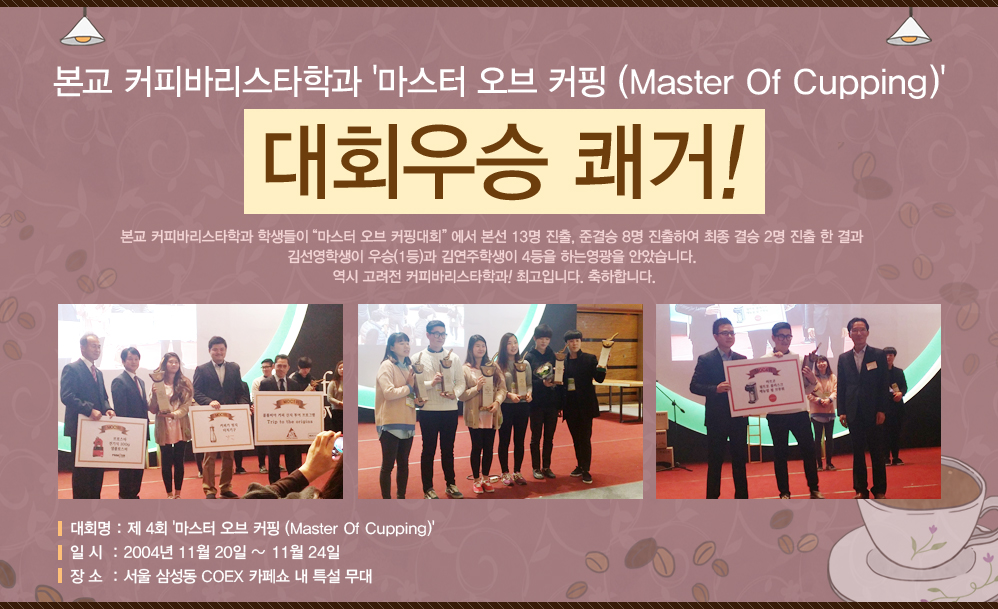 - [12월] 커피바리스타과정 '마스터 오브 커핑(Master Of Cupping)'대회우승 쾌거!
