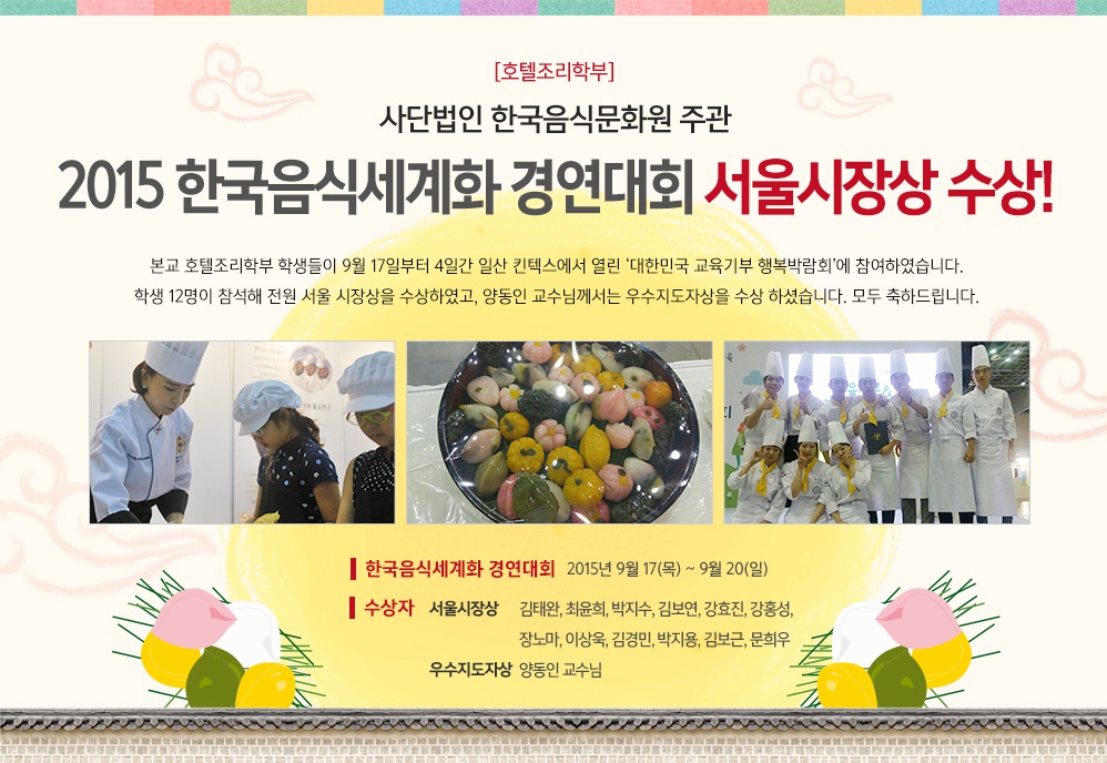 - [9월] 2015 한국음식세계화 경연대회 서울시장상 수상!